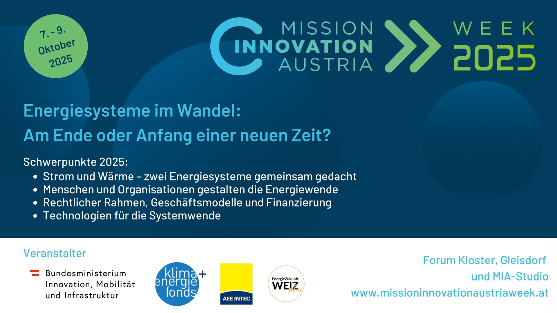 Gleisdorf, (06. Oktober 2025) – Unter dem Motto „Energiesysteme im Wandel: Am Ende oder Anfang einer neuen Zeit?“ lädt die Mission Innovation Austria Week (MIA) 2025 vom 7. bis 9. Oktober ins forumKLOSTER nach Gleisdorf. Die renommierte Konferenz hat sich als DER Treffpunkt für alle etabliert, die an der regionalen Energiewende arbeiten und innovative Lösungen für eine nachhaltige Energiezukunft entwickeln.